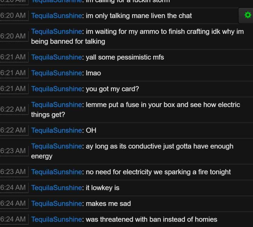 I literally had no other reason to ask you to stop nor did you ask me for any clarification on why i asked you to stop. You acknowledged my request by deciding to antagonize and state "yall some pessimistic mfs" and then continuing with more lewd banter. As for banning within "seconds", the ban was issued until 5 minutes later. As for the minor issue, there is no legal or physical means to gain access to personally identifiable information in which to screen players for age authenticity. Should parents monitor the activities of their childeren? Idealy, yes. Server rules state no harrassment, to include sexual harrassment, which excessive innuendo falls under with or without players expressing like or dislike. You acknowledge these rules when you first join the server. -