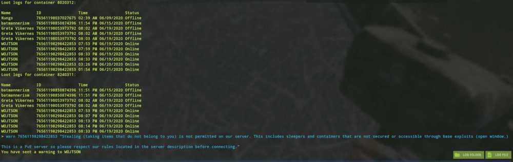16. Offender: WOJTSON STEAM Server: US Pure Time: 9:00 PM EST Length: Permanent. Reason: Stealing, raiding, looting. More Info: Player was given numerous PSAs, one verbal, and two official warnings about stealing and looting. They refused to stop their PVP behaviors leaving us with no choice but to enforce a permanent ban. Logs are shown below.