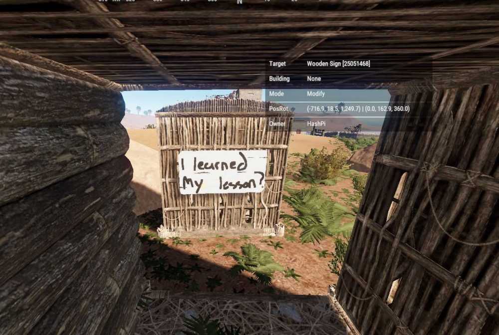 6. Offender: sir sexalot STEAM Server: US Pure Time: 7:31 PM EST Length: Permanent Reason: Raiding, Looting More Info: After being spoken to at length, (and warned about in chat banter as well as entering bases that do not belong to them,) as well as multiple PSAs, player chose to attempt Grand Theft Auto. When this failed, they attempted to steal the parts. When confronted, they immediately logged out.