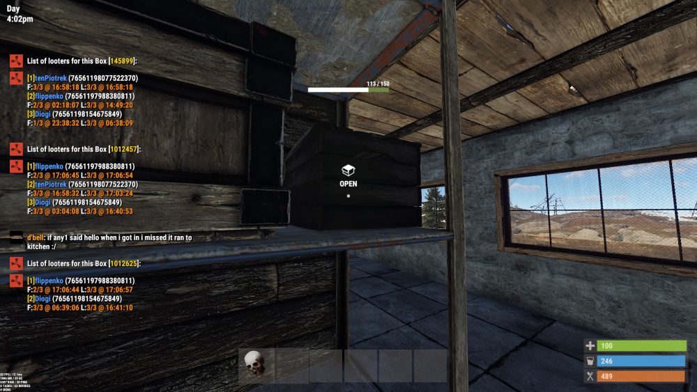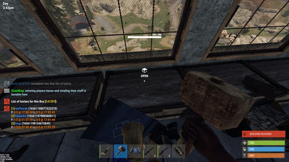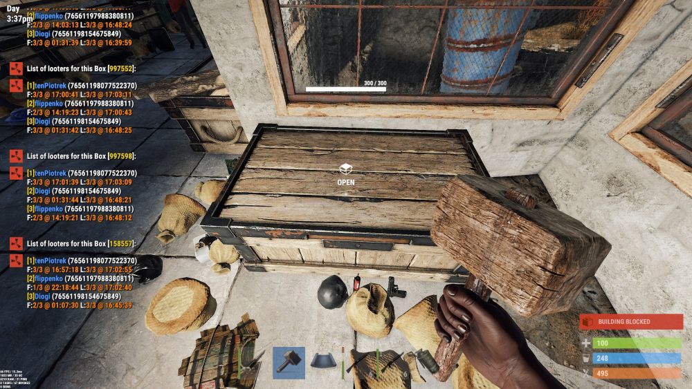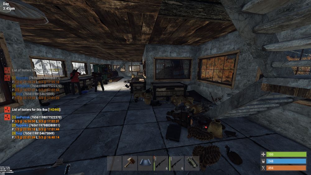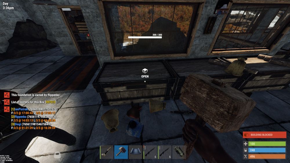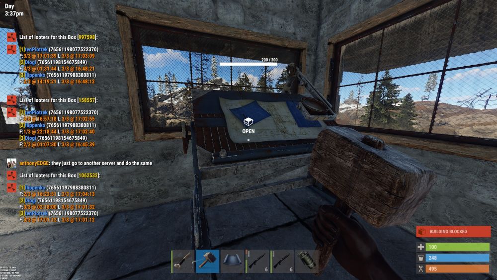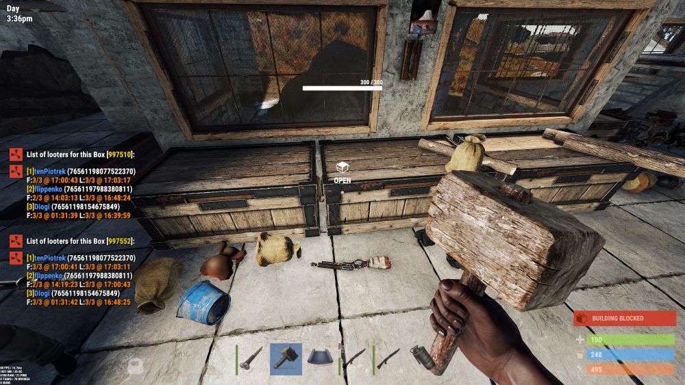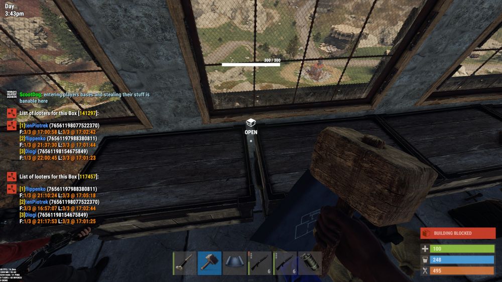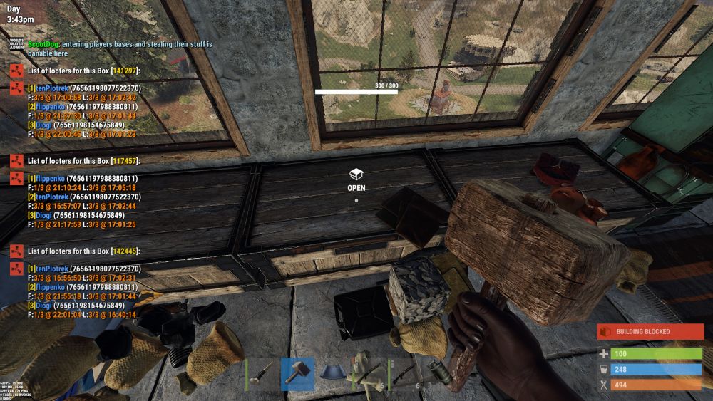 Time: 0820 Length of Ban: Permanent Reason: Raiding/Looting Server: Pure PvE More Info: Flippinko called me to his base saying that he was robbed. When I arrived I saw that he was completely cleared out and there was one name on just about all the boxes - Oofise. Oofise was able to authorize on Flipp's TC and then place a sleeping bag inside Flipps house to gain access to his base. He then placed boxes outside Flipp's base to pass loot through the window. Oofise used twig stairs to access the roof of Flipp's house where he was able to steal more items from Flipp. The player also placed barricades outside their home in the open. Oofise has been banned permanently from the server.