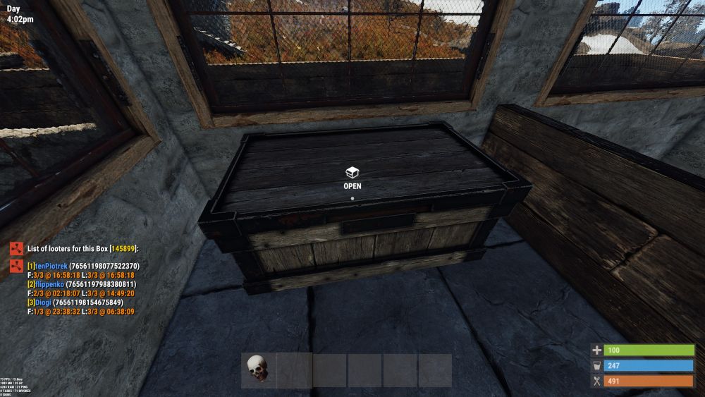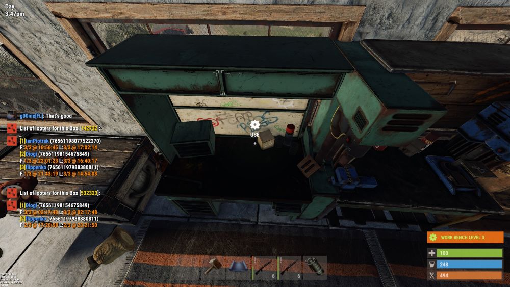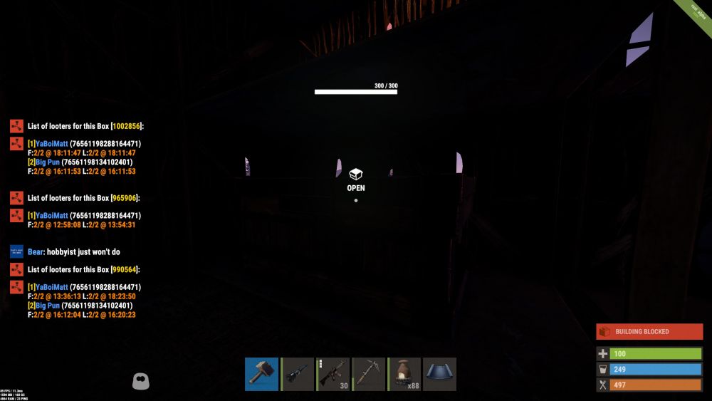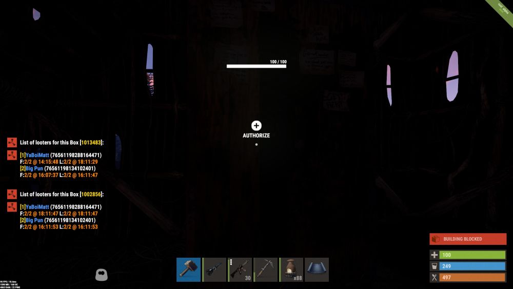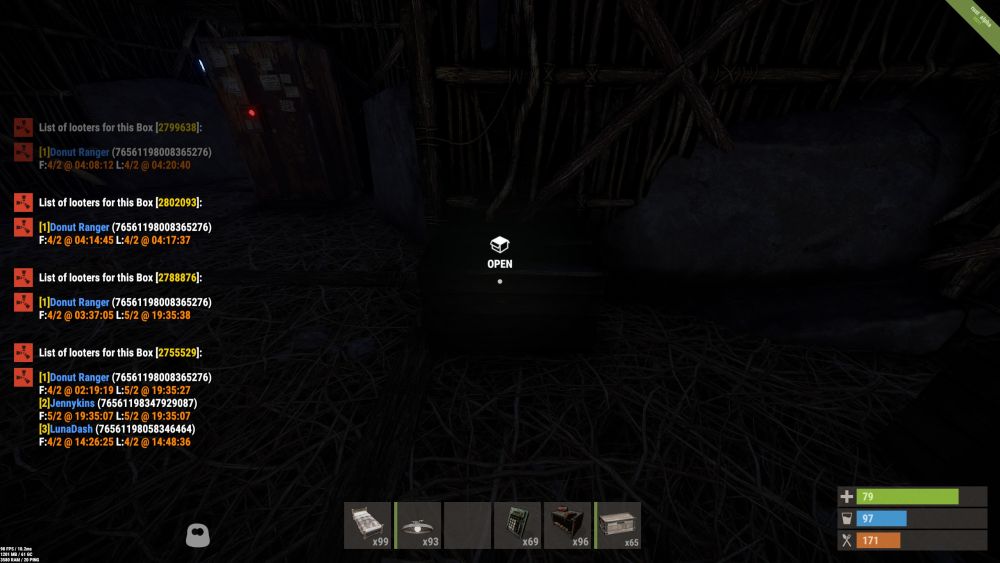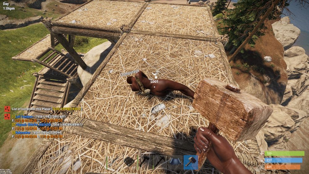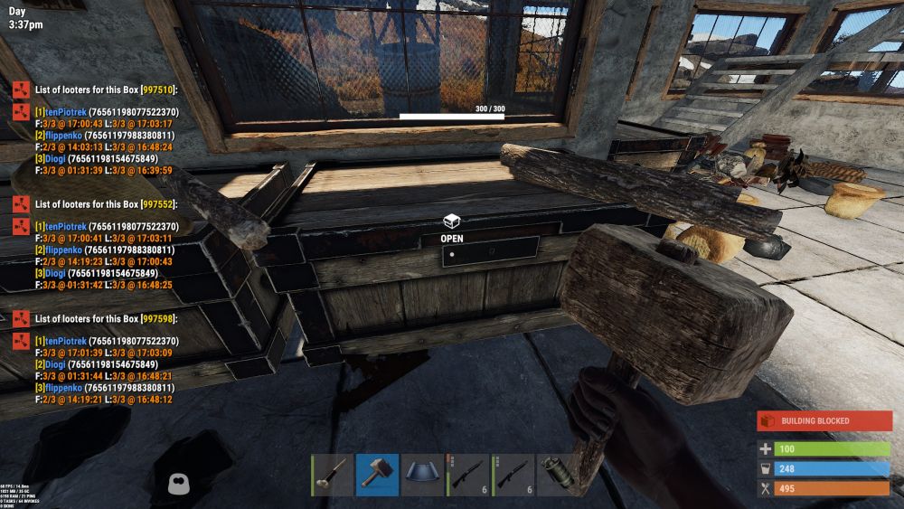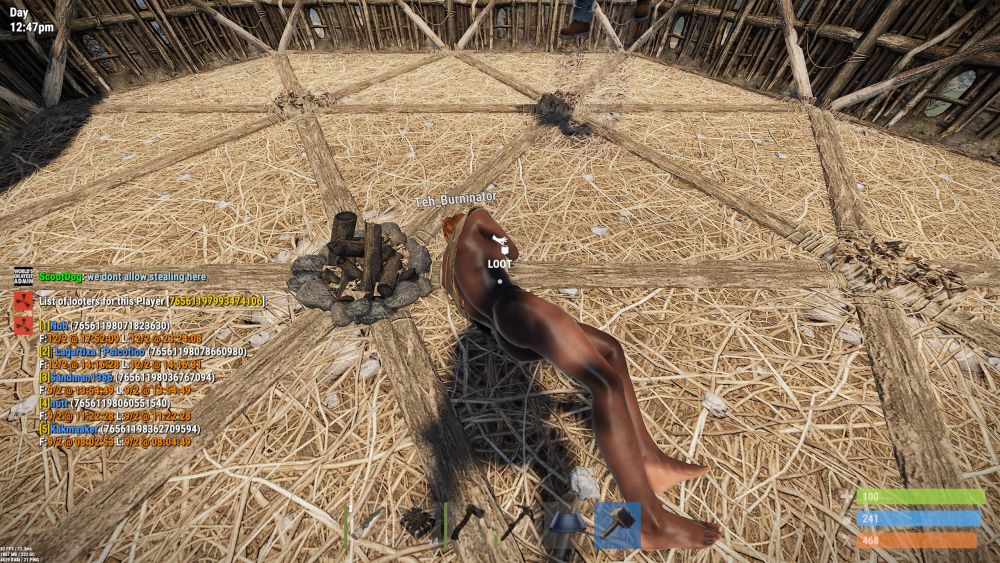 Time: 0820 Length of Ban: Permanent Reason: Raiding/Looting Server: Pure PvE More Info: Flippinko called me to his base saying that he was robbed. When I arrived I saw that he was completely cleared out and there was one name on just about all the boxes - Oofise. Oofise was able to authorize on Flipp's TC and then place a sleeping bag inside Flipps house to gain access to his base. He then placed boxes outside Flipp's base to pass loot through the window. Oofise used twig stairs to access the roof of Flipp's house where he was able to steal more items from Flipp. The player also placed barricades outside their home in the open. Oofise has been banned permanently from the server.