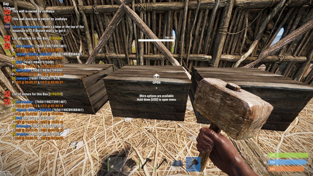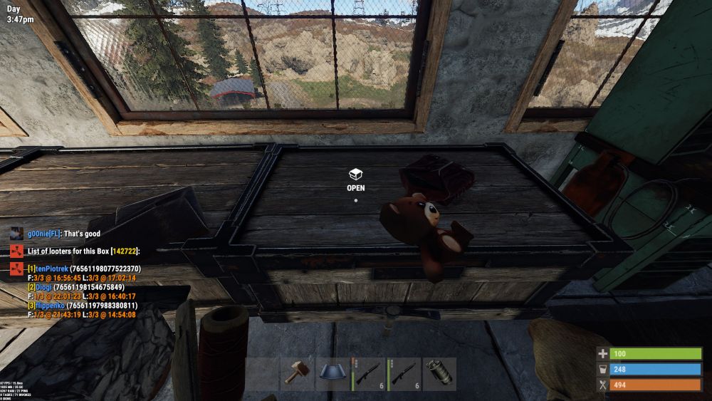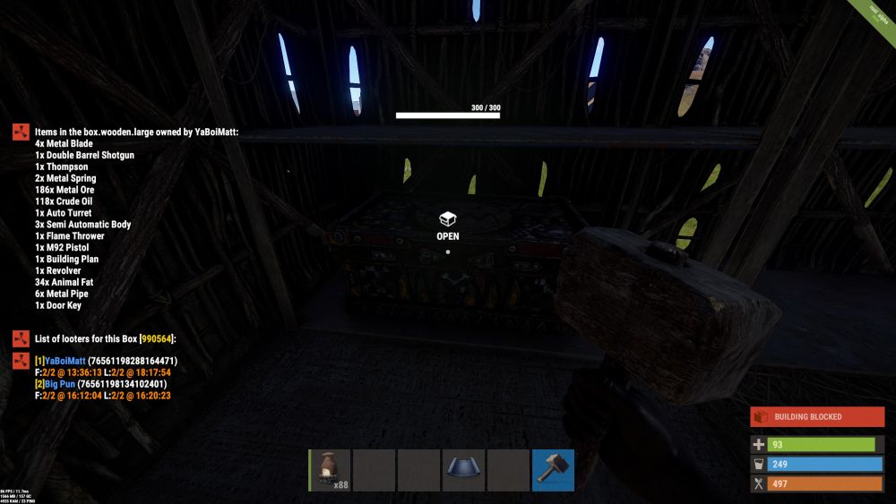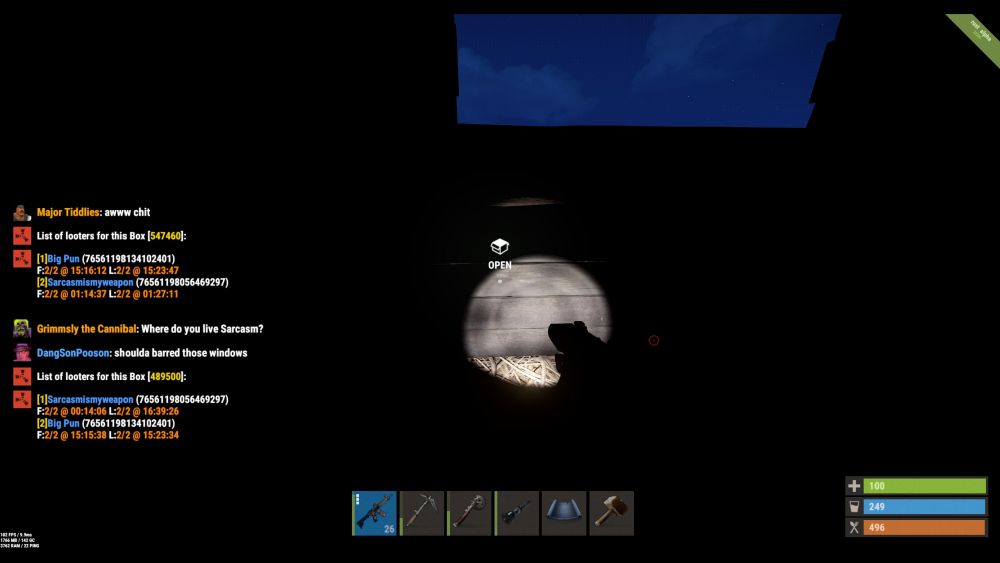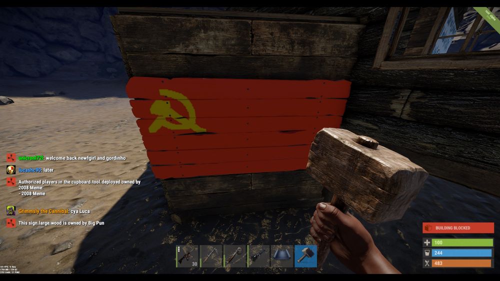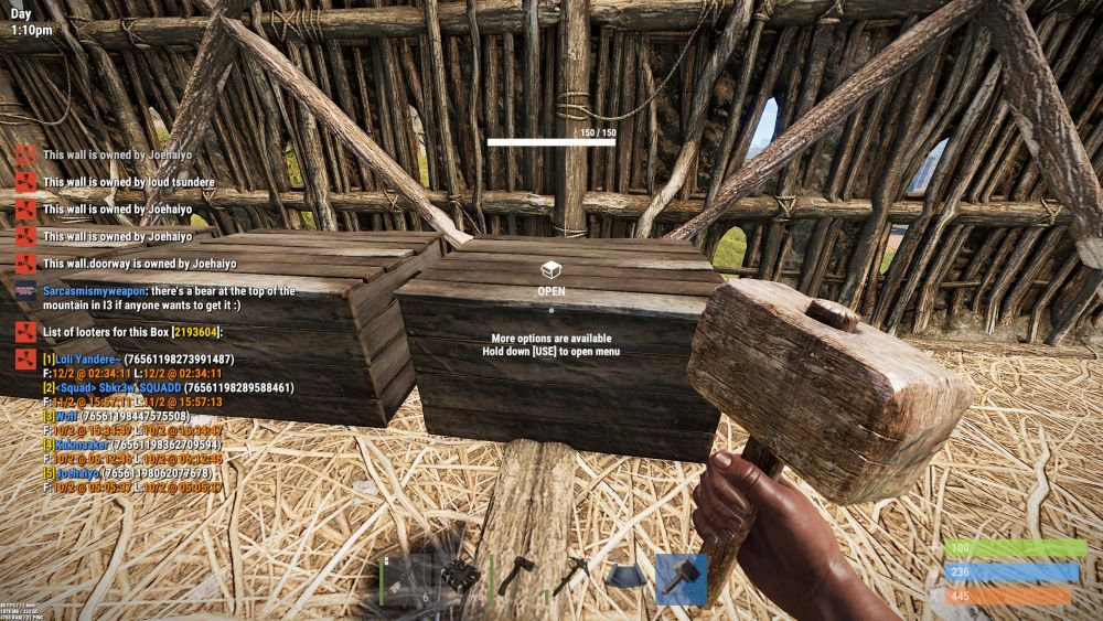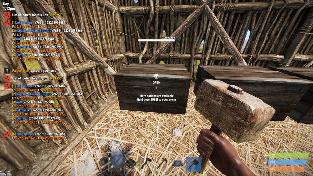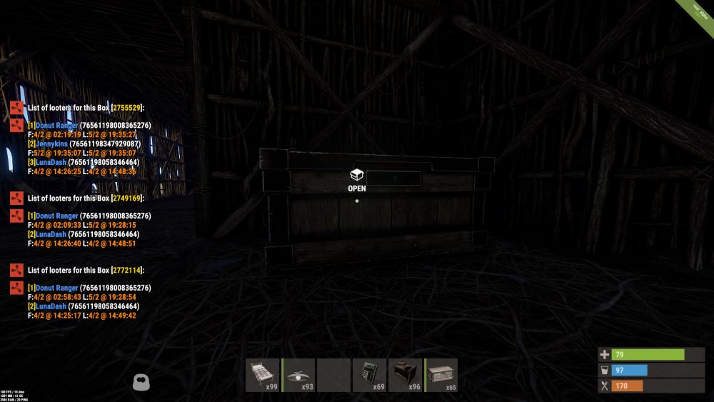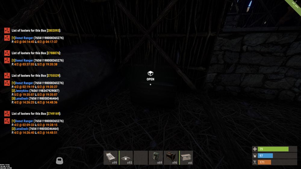 Time: 0820 Length of Ban: Permanent Reason: Raiding/Looting Server: Pure PvE More Info: Flippinko called me to his base saying that he was robbed. When I arrived I saw that he was completely cleared out and there was one name on just about all the boxes - Oofise. Oofise was able to authorize on Flipp's TC and then place a sleeping bag inside Flipps house to gain access to his base. He then placed boxes outside Flipp's base to pass loot through the window. Oofise used twig stairs to access the roof of Flipp's house where he was able to steal more items from Flipp. The player also placed barricades outside their home in the open. Oofise has been banned permanently from the server.