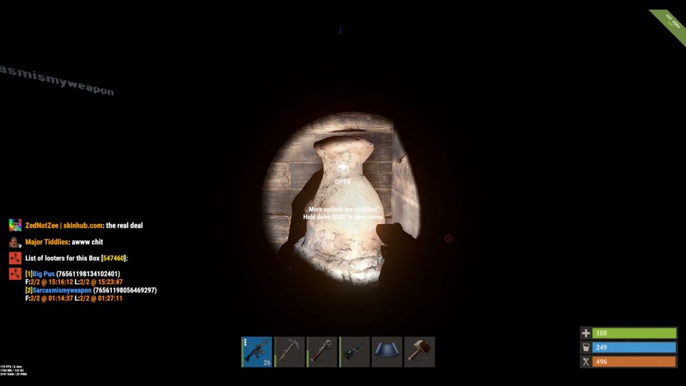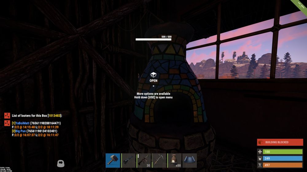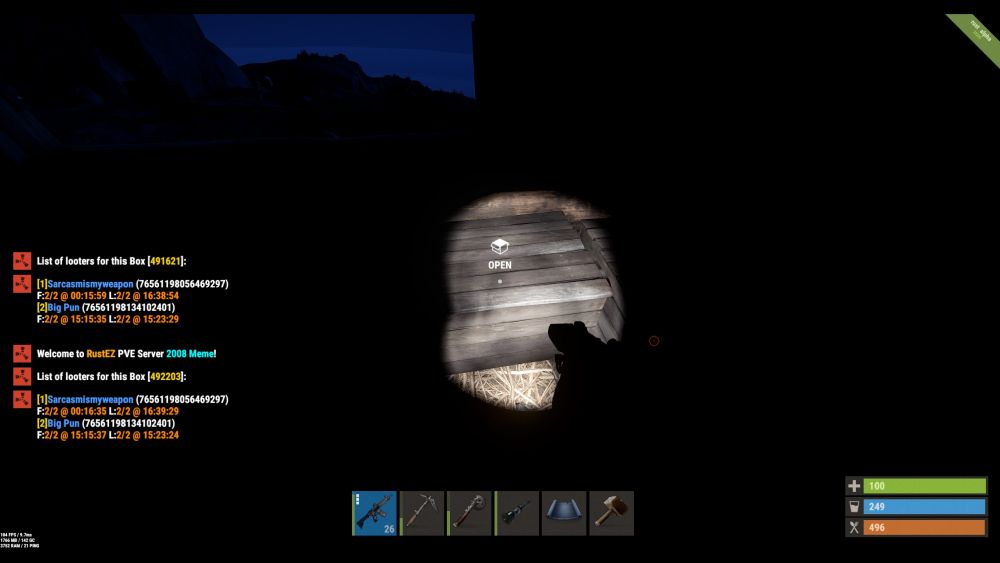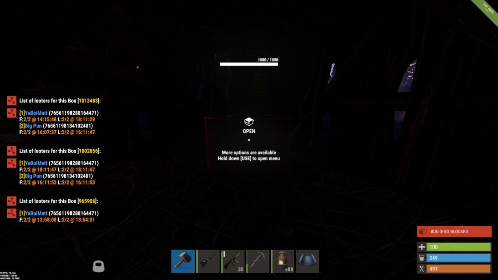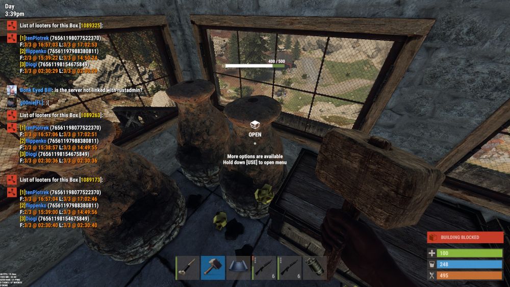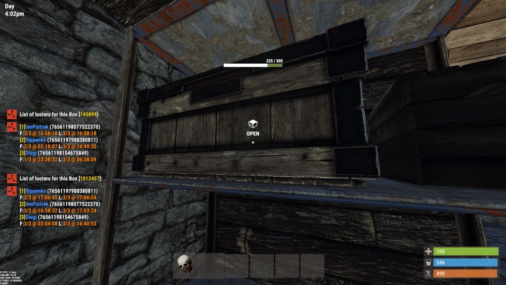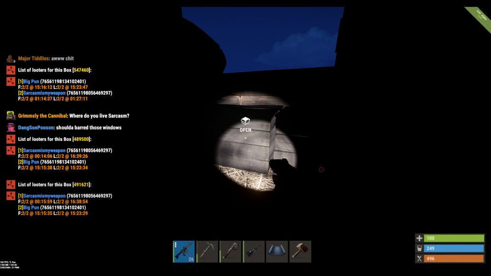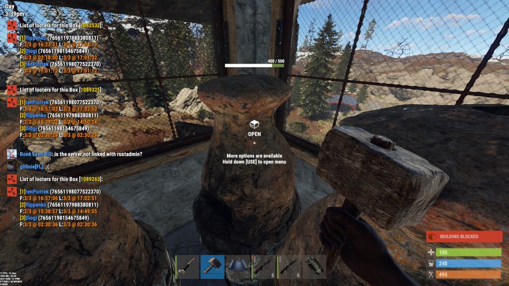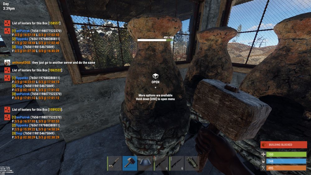 Time: 0820 Length of Ban: Permanent Reason: Raiding/Looting Server: Pure PvE More Info: Flippinko called me to his base saying that he was robbed. When I arrived I saw that he was completely cleared out and there was one name on just about all the boxes - Oofise. Oofise was able to authorize on Flipp's TC and then place a sleeping bag inside Flipps house to gain access to his base. He then placed boxes outside Flipp's base to pass loot through the window. Oofise used twig stairs to access the roof of Flipp's house where he was able to steal more items from Flipp. The player also placed barricades outside their home in the open. Oofise has been banned permanently from the server.