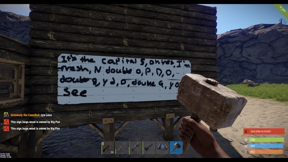 Reason: Raiding/Looting/Editing Signs Length Of Ban: Permanent Time: 1645 EST Server: Pure PvE More Info: A player told me that his signs had been vandalized earlier and i found Big Pun to be the one that changed them, as well as gaining unauthorized access to this players base to get on the TC to change the signs. I was now notified that a players home had been broken into. This player was completely cleared out and Big Pun had made multiple trips and only left 400 metal ore in the furnace. They have been banned.