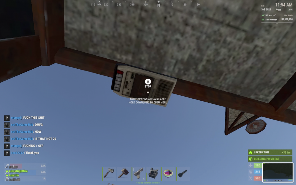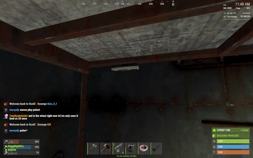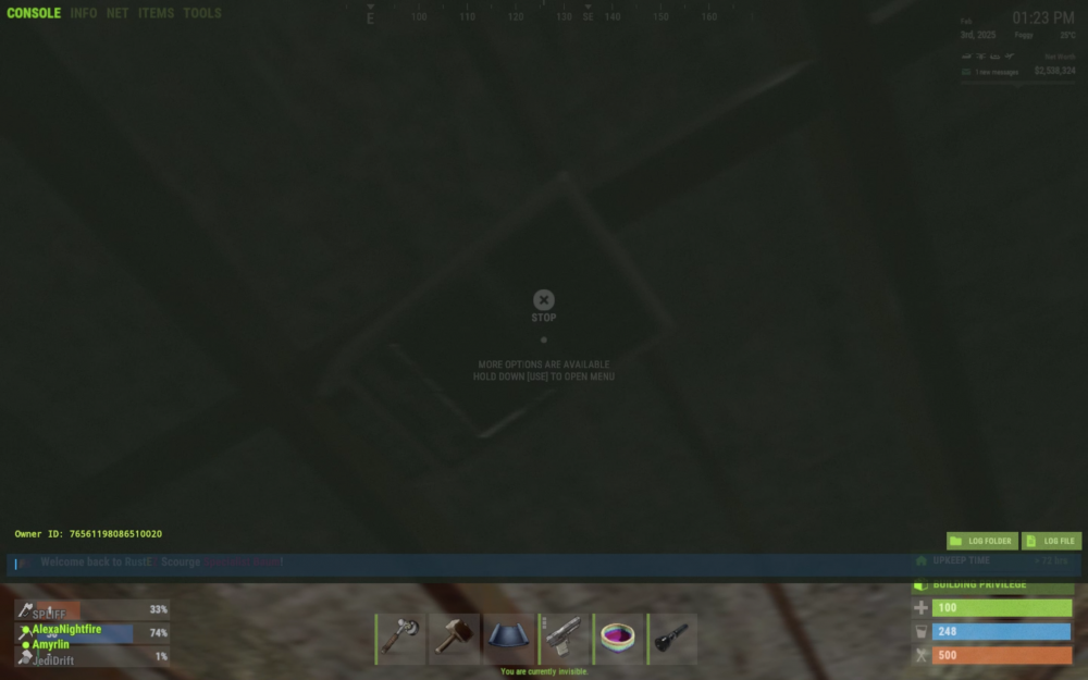 Hello there, I am looking into this for you, and will follow up with you one-on-one. Just for future reference, this is the Bug Reports area, and is more suited for reporting server/game bugs that affect multiple players. For scenarios like the one described above, your best bet is to file an individual help request at https://rustez.com/help/ instead so that we can follow up with you. 🙂 -Alexa -