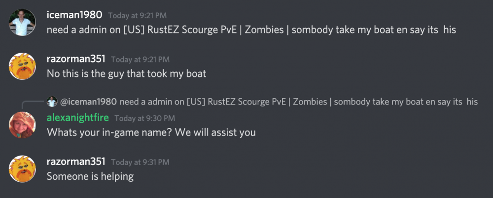 4. Thank you for following the appeals process, and for accepting responsibility for your words and actions. I am willing to reduce the ban to 5 days. This means you are getting a second chance to play on our servers. The ban will be lifted once the remaining time (about 3.5 days) has passed, but it will remain on your record. There will be no additional chances as this post should encourage you to change how you speak and behave in our servers and to abide by the rules. Any further warnings or rule infractions will result in a permanent ban. Take a few minutes before rejoining, and refresh yourself on the rules to avoid any chance of breaking them. If you are unclear on any of them, or aren't sure what is permitted, reach out to the staff and we'll be happy to clarify them for you. ● No raiding, griefing or looting of any kind. ● No mic or chat spam, player disrespect, politics, racism or harassment. ● No camping loot rooms, monuments or any highly concentrated areas. ● You may build in caves but you must ensure safe passage for other players. ● No blocking water ways, building around monuments or large areas of unused land. (Please read the splash page as well, as each server type has slight variations regarding specific features of those servers.) Welcome back. (Please bear in mind, this is a one time ban reversal. No further rule infractions of this nature can happen. Thank you!) -Alexa