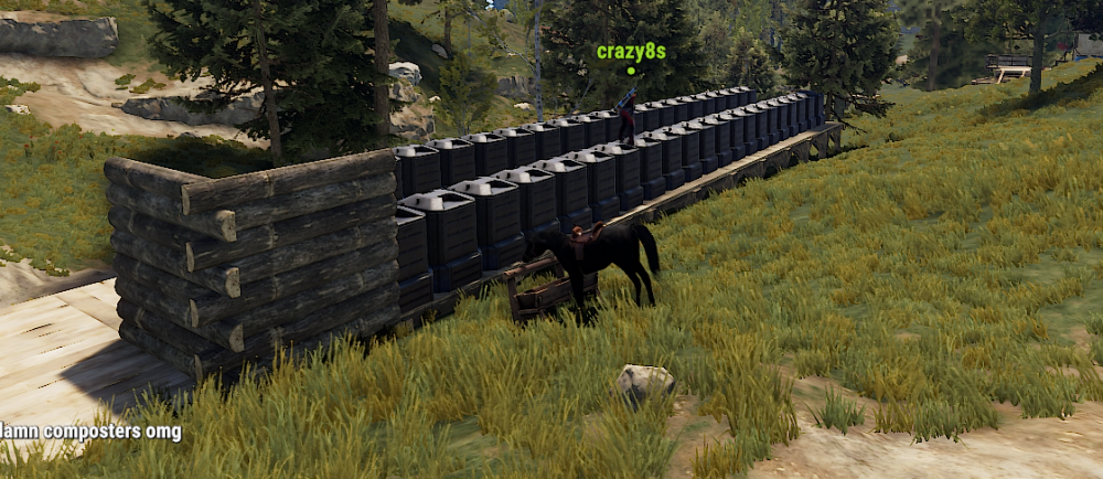 3. There is a massive wall of composters near bandit camp that appeared today. They are causing some serious frame drops and lag in that area. Grid is Q16 and the x:260, z:-224 is the exact area