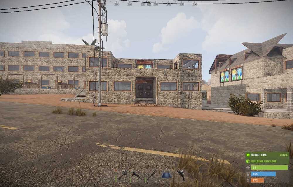 With the upcoming changes to building blocks (particularly the foundation stairs), there's a chance this may be the last time I can create a town like this... The town is currently standing in J8 on the AU Pure server should you wish to have a look around (If you find a weapon, the automated range is a lot of fun). Sadly I haven't had time to fully furnish the houses or get lights in as yet. It also appears that there is 1 wall section of terrace house connected to the shooting range that is also missing in the pictures). It seems like the wipe has almost enirely consisted of scavenging resources, but the result doesn't seem too bad. For those interested, it is in 3 sections with the following upkeep: North side: Sherrif's office and jail - 3 single cells and one larger holding cell. (furnished) Town hall (rafters not quite finished and only 1 "chandelier" remains inside following fights with rust stability gods. Large house (unfurnished) Terrace houses (unfurnished) Gun store (shooting ranges inside at rear). Foundry - currently contains 3 large furnaces, 1 refinery, and 6 large batteries to power entire town. 6,293 wood 72,046 stone 15,281 frags 19 HQ South East side: Farming and plumbing supplies Vet and Medical supplies Shop and house (unfurnished) The mian hotel (accomodation on upper floors). Housing supplies with 2 houses on upper floor. Helipad and hangar (can fit 2 large helicopters side-by-side) 10,510 wood 38,852 stone 6,031 frags South West side: Clothing store with house above (unfurnished), secondary hotel on left. Diner. 5,334 wood 17,346 stone 2,343 frags