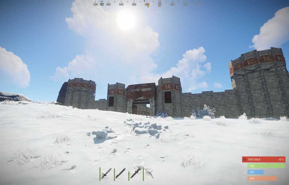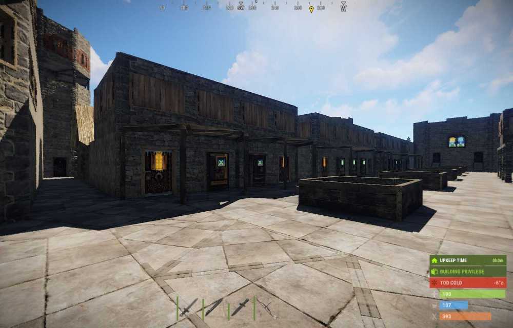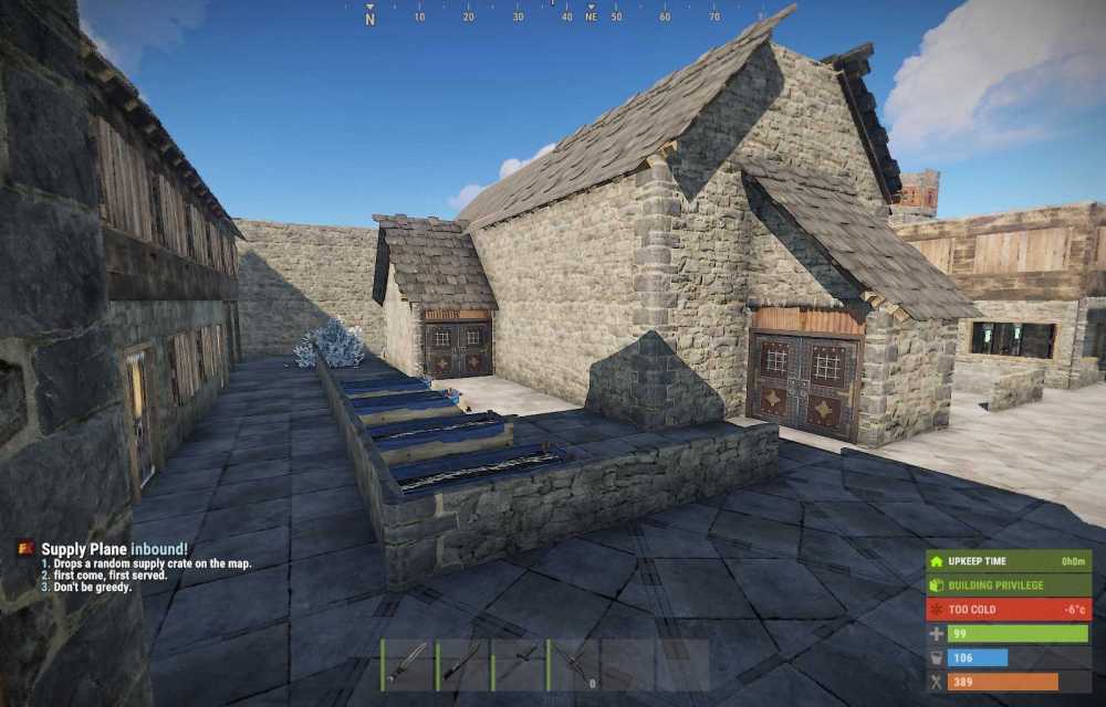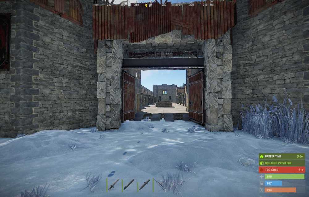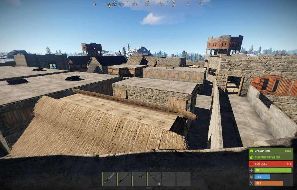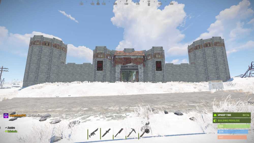 Having built a town for both previous wipes (and not being well on wipe day, meaning I couldn't get the spot I wanted), I decided not to build a town this wipe, and instead to build something I had wanted to try for the past few wipes (R19 on AU Pure - first time I have built on an ice lake...) Upkeep (Stone - 249k, Wood - 34k, Metal frags - 11k, HQ - 262): And here is what I ended up with: On approaching the gateway: Looking around from the gateway: Blacksmiths shop: Church: "Great hall": Dungeons: Slums (with herbalist house): Shooting ranges: A few more pictures (including roof of stables): I had hoped to finish this earlier, but the rarest resource needed for this was in very low supply - inspiration...So, unfortunately, I haven't been able to furnish all the houses, nor stock the shops. The towers aren't quite as I planned, but that is to allow for multiple people to try and take down patrol heli from multiple angles. Feel free to visit at any time prior to wipe and explore the build (be warned that it may be cold in the area...It is built on an ice lake, after all.)...And remember: this isn't a town. And I am going to miss this place when wipe hits.