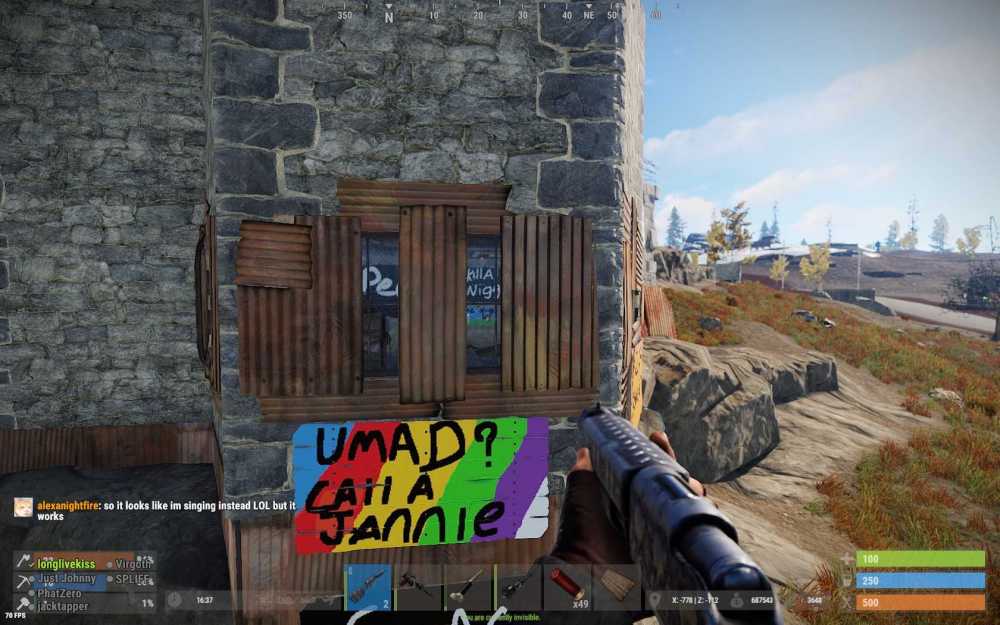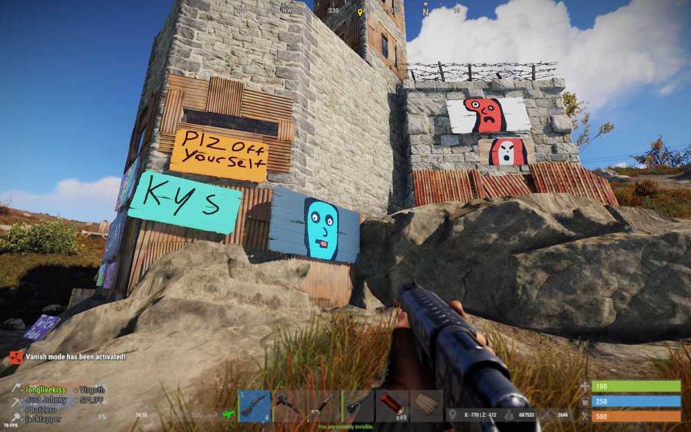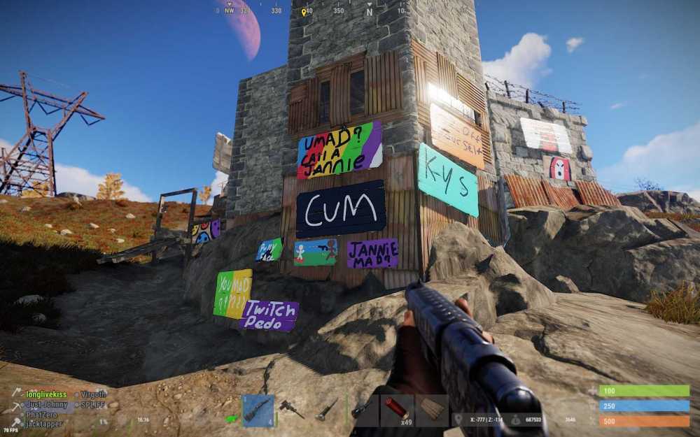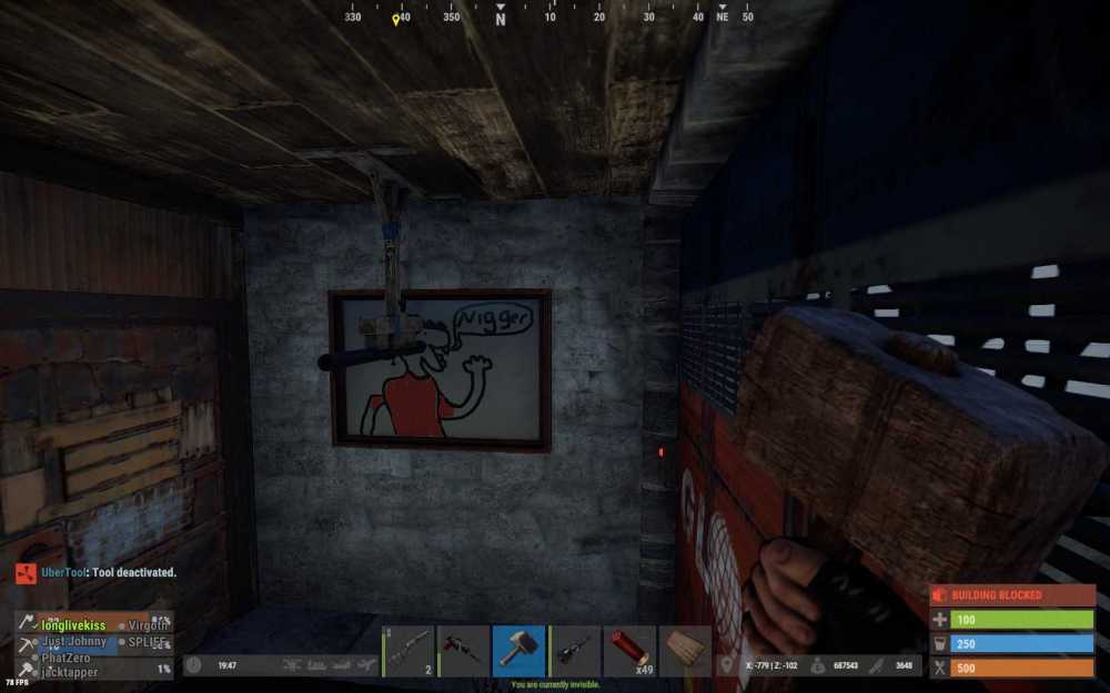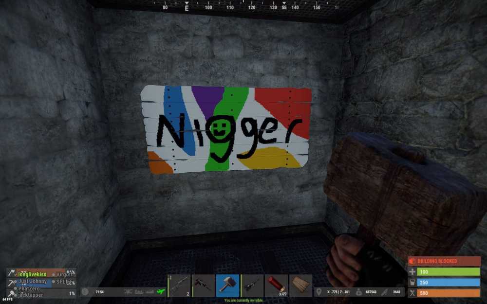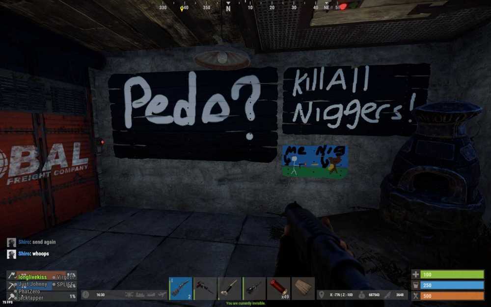 Offender: Trash Wizard Server: US Scourge Time: 1:49pm EST Length: Permanent Reason: Racism and Toxicity More Info: Invesigated pictures on outside of base. I could see inside to even more toxic pictures. Placing below for evidence.