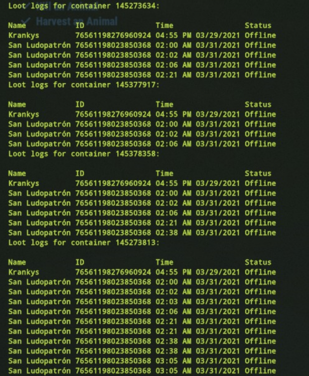 Offender: San Ludopatrón BM: https://www.battlemetrics.com/rcon/players/95438596 Steam: https://steamcommunity.com/id/lPresi/ Server: US Pure Time: 1:39pm (est) Length: Permanent Reason: Raiding Stealing, Homophobia More Info (Optional): This player was console warned against stealing/raiding bases. When confronted he denied taking anything. Logs will show otherwise. This player knew it was against the rules and asked in chat about raiding wood bases and was informed is was against the rules and was asked to type /rules in chat to bring up the rules of the server that he needs to abide by in order to play on our servers. Even after the talk in gen chat the player raided bases and denied any wrong doing. Initially I was giving them a 3 day but upon further investigating it was extended to a permanent ban as he broke into other players bases and repainted a sign something Homophobic in nature. I have proof of sign avail. upon req. The rest of the logs will be attached.