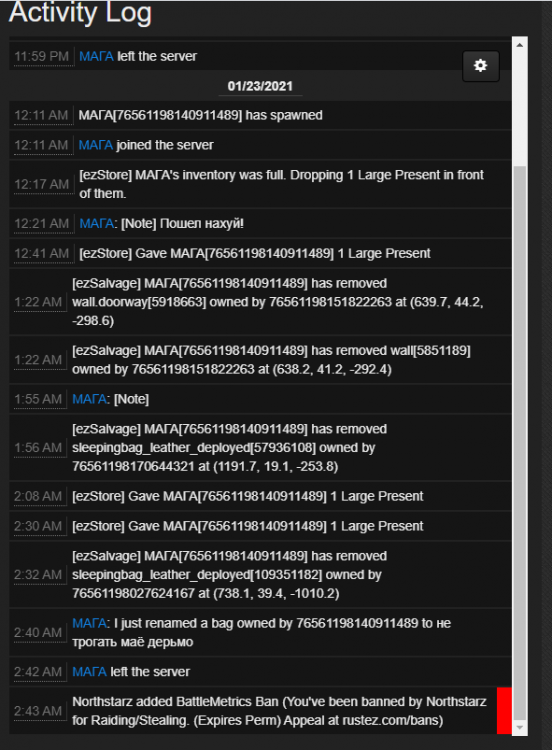 Offender: МÐГРBM: https://www.battlemetrics.com/rcon/players/69146215 Steam: https://steamcommunity.com/id/vodkinjist228/ Server: US Pure Time: 2:43am Length: Perm Reason: Raiding/Stealing from players and bases More Info (Optional): This player was first verbally warned along with his teammate by another admin (Carpediems) about entering players bases through base exploits..sent them along informed of our server rules. МÐГРand teammate nodded in acknowledgement and carried on down the map. At 2:13 am I was dm'ed that a player witnessed 2 players boosting each other through, on and into bases. Noticed that they were being watched by the player who notified me they left for a short time circling back to see if they were still being monitored. I console warned them about the server rules. Upon further investigation I noticed that they were also gaining tc access, removing base parts to gain access , sleeping bags and other entities/deployables. The players base is filled with loot that was gained by breaking RustEZ rules and policies.