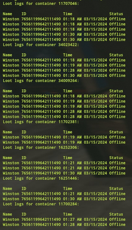 Offender: BloodyxMan Battle Metrics Steam Profile Server: US Pure Time: 03/20/2024 3:36 PM Eastern Length: Permanent Reason: Raiding More Info (Optional): BloodyxMan was first warned on 03/16/2024 when they entered a base and stole items from a player who was offline. They were warned and informed of the server rules and what would happen should they continue to break those rules. I was summoned by a player who was quite distraught for being raided on 3/20/202 by BloodyxMan. After a thorough investigation I found that BloodyxMan had taken an astronomical amount of loot from that player/teams base as well as from their bodies while they were offline and a modular vehicle which was found along with the players items in BloodyxMan base. Due to the gaming history if BloodyxMan and his disregard for the rules after given him ample opportunity to abide by the server rules it was decided a permanent ban would be placed for Raiding/Stealing. Due to the large quantity of logs I have only put some. Rest available upon request.