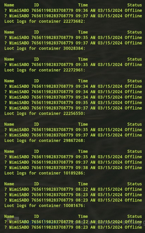 Offender: 🔰 MimiSABO Battle Metrics Steam Profile Server: US Pure Time: 10:20pm eastern Length: Permanent Reason: Raiding/Stealing More Info (Optional): 🔰 MimiSABO was first warned on 7/8/2021 for accessing a players base through a base exploit and stealing items from within. 🔰 MimiSABO was warned once again on 3/13/2024 for griefing/stealing and was warned in English and Turkish informing them of the server rules to ensure they understood and give them a chance to reform and be a part of our community. I had a few reports of thefts and complaints of a player attempting to take modes of transport while the owner was present and warning them not to. Upon investigation It was found that 🔰 MimiSABO accessed a fair number of player bases and raided from all deployables within the bases that they were able to; At times making a couple of trips to ensure they cleaned the player they were stealing from out of everything they could take. 🔰 MimiSABO was given every opportunity to adhere to the rules of our RustEZ servers and made the choice to steal, raid and grief from multiple members of our rule abiding community earning them a permanent ban from our servers. Due to the extensive amount of logs I have only posted a few. More available upon request.