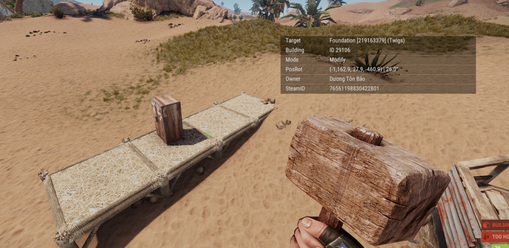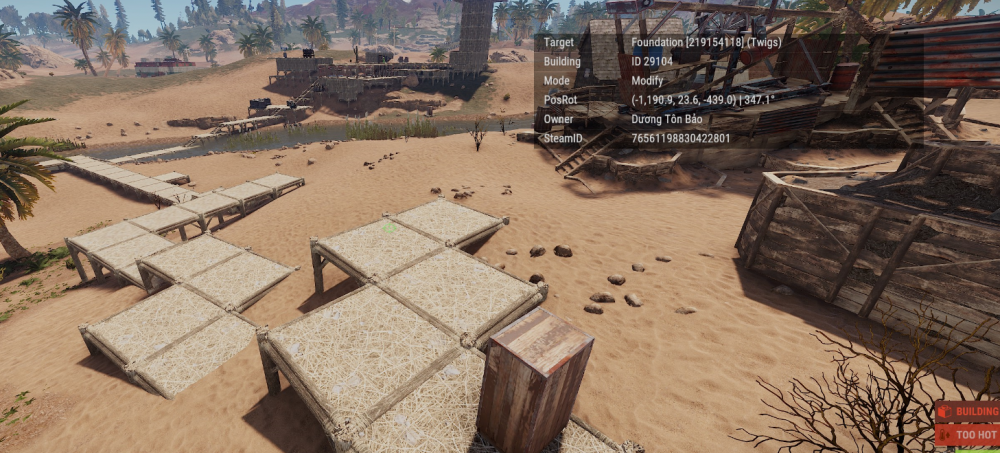Offender: Dương Tôn Bảo https://steamcommunity.com/profiles/76561198830422801 https://www.battlemetrics.com/rcon/players/750666681 Server: AU Scourge Time: 21/01/2021 8:01 PM Length: permanent Reason: Raiding, looting & stealing from other players More information: Player previously given multiple warnings for theft & attempting heli-raiding other players bases. Was non-responsive on each occasion. Now has intentionally built elaborate structures in order to gain TC access to numerous players pumpjacks & access them. Further screen shots available on request