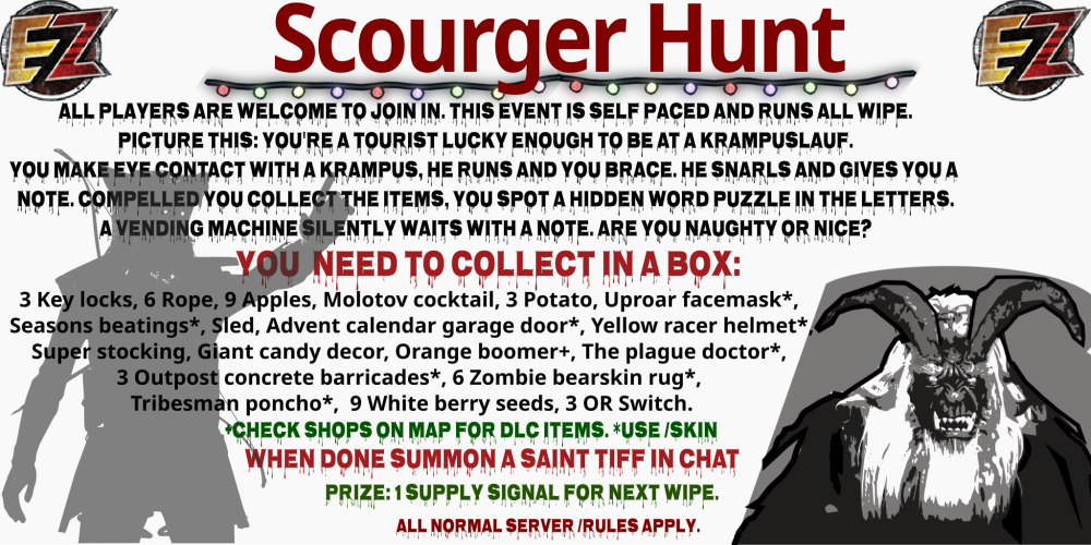 All players are welcome to join in on AU Scourge on another Scourger Hunt. Scourger hunt is a scavenger hunt on AU scourge. You will need to collect all the items and place in a box and then summon a TiffDust in chat. The Scourger Hunt canvas of the picture below can be found ingame at the Community center outside Outpost in Q15 and inside public pump jack spawn huts. First to finish $10.00 RustEZ store credit. Second to finish $5.00 RustEZ store credit. Third to finish 3 Supply Signals. All who finish get 1 supply signal on AU Scourge next wipe. *You need to summon a saint Tiff (TiffDust) ingame public chat (Don't wait for an admin or myself to be online to do so.) It needs to be checked by an admin that you have all the items, read the whole Scourger Hunt image carefully. Absolutely do yourself a favor and watch the many krampus youtubes. 🤠(OMG did you get the reference? You are old my friend and shush it's 3am atm.)
