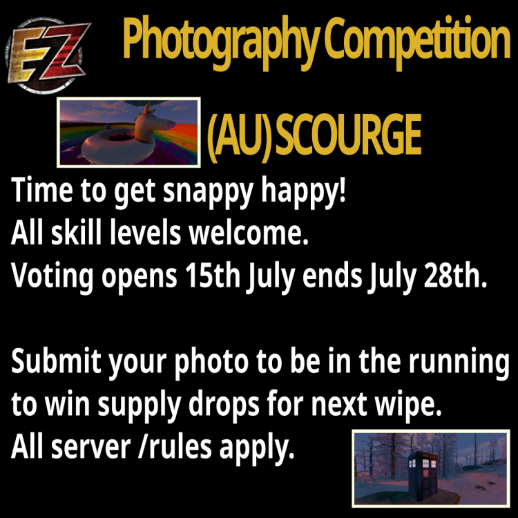 Create a scene, catch something funny or snap a sunset. If you are unable to craft a camera they are available at community centre at V12 and info hut at Stone quarry. Submit your best photo asap, the longer your photo is seen during the voting time the more likely it will get votes. Add your name to the title of your photo and drop your photo off at community centre at V12 or info hut at Stone quarry. Voting: Photos will be displayed in game for the community to vote on. 1 vote per player. Details and location to be made available at later date.