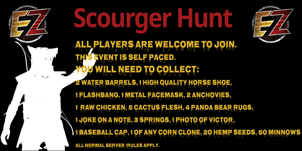 Sign up in AC 19. Write your name on a note, if doing it as a team write all your names on the 1 note. Collect items and store them in a large box in your base or at i21. Summon a Tiff when complete. Participation reward Supply Signal for next wipe. Last day 28th of August. 1st September AEST. (extending time limit)
