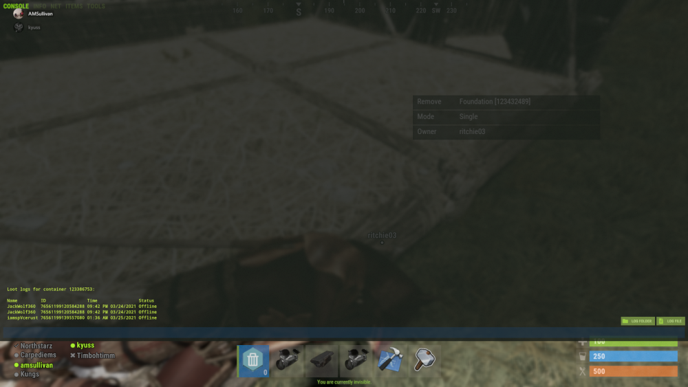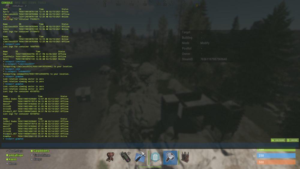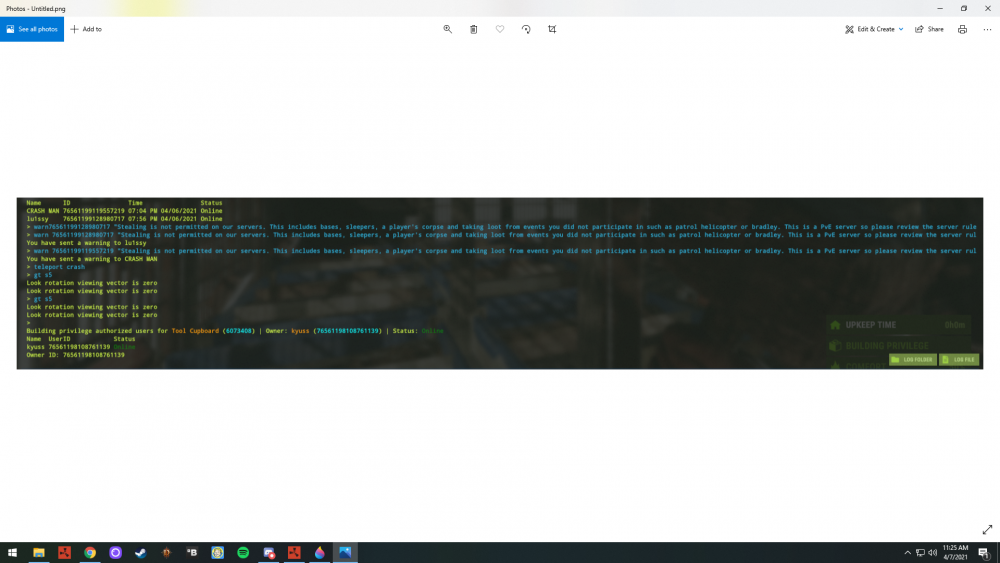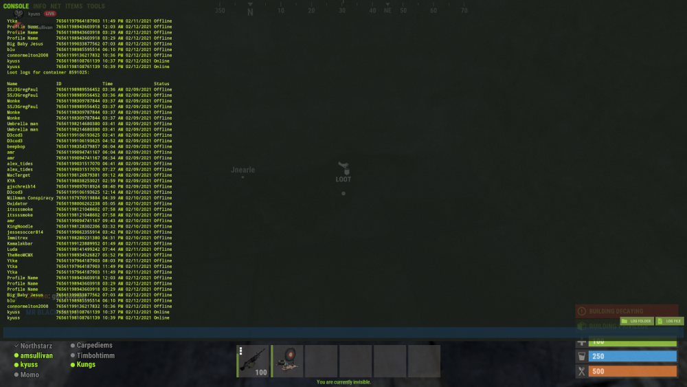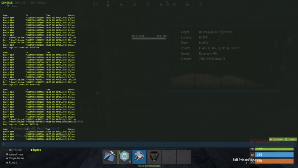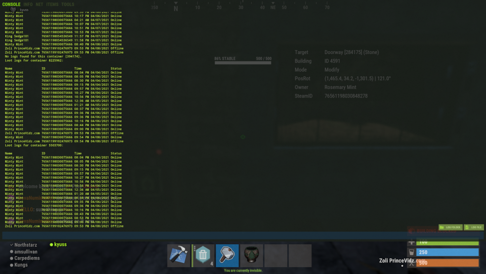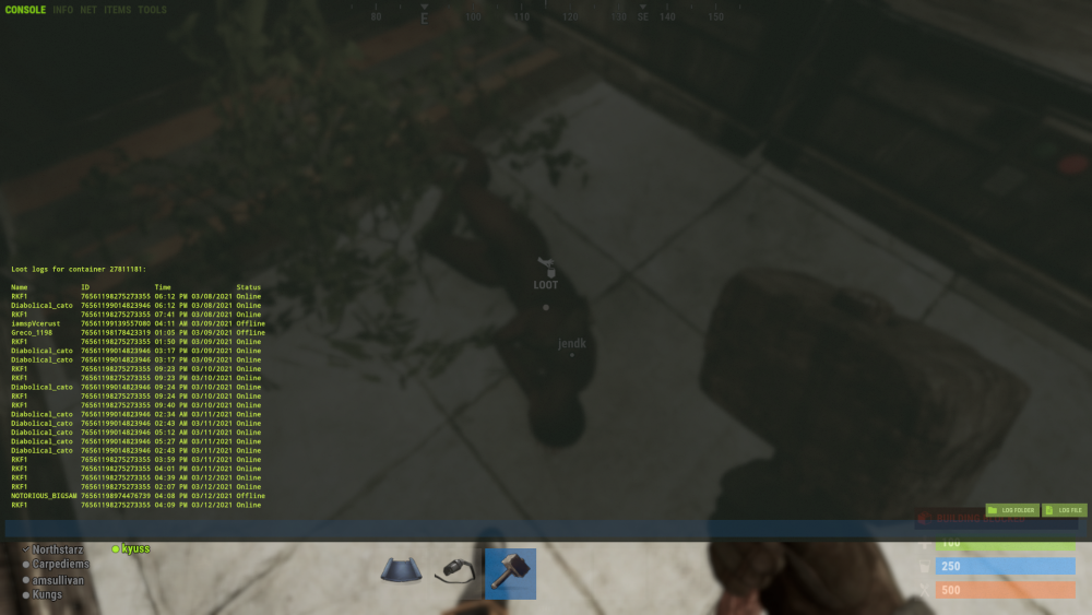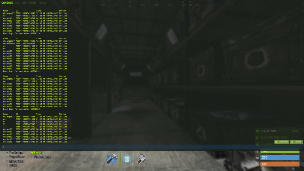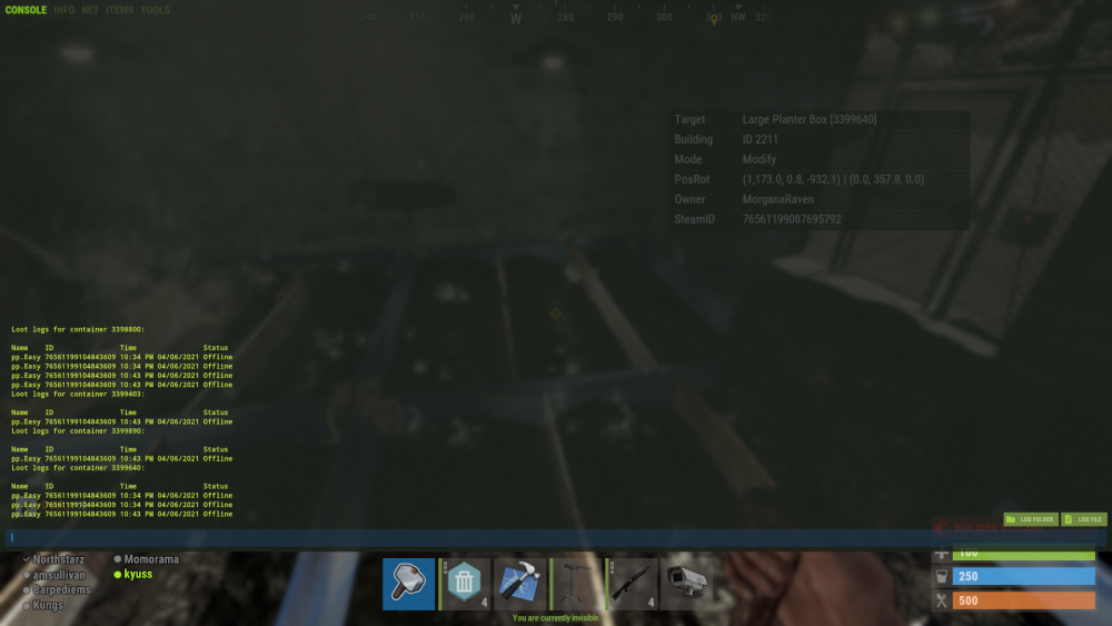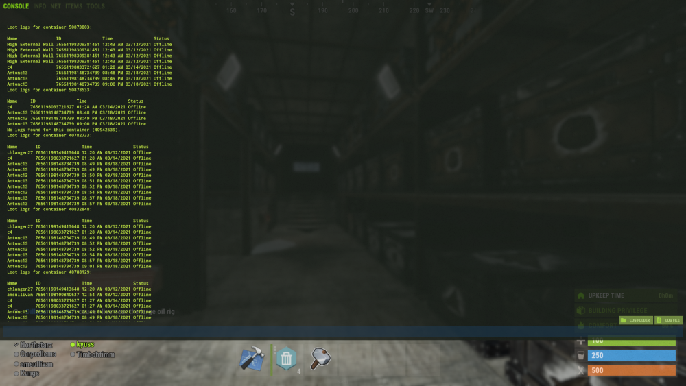 this player has been on boxes furnaces given himself building priv on other peoples houses furnaces refineries etc, at least 10 seperate houses investigated today have had this name on loot logs.