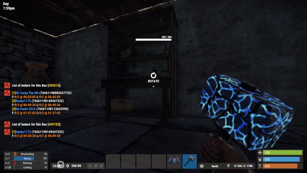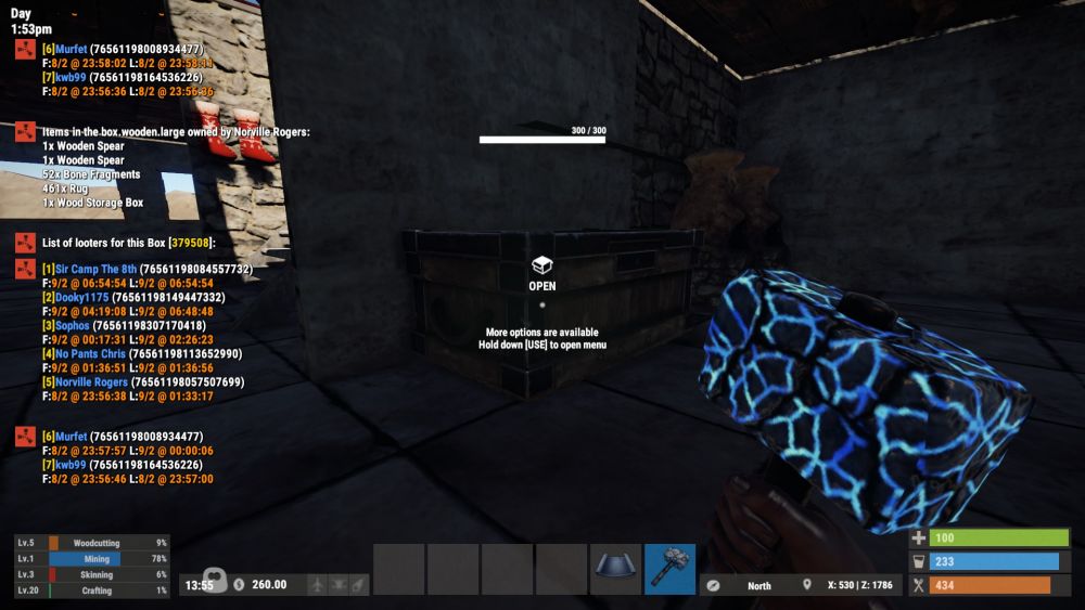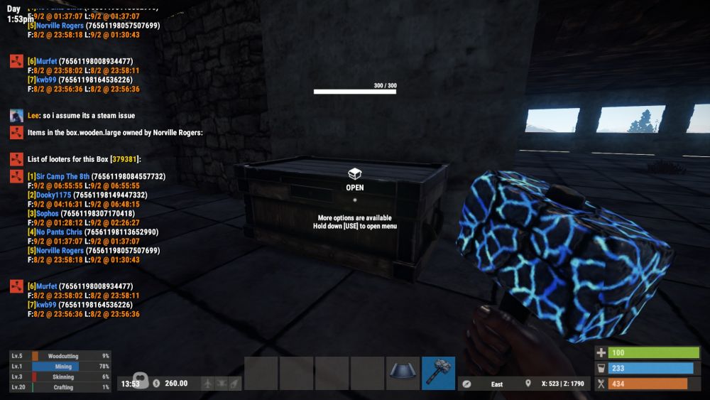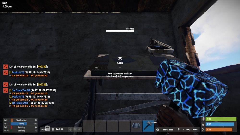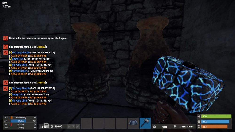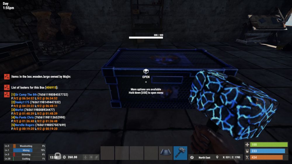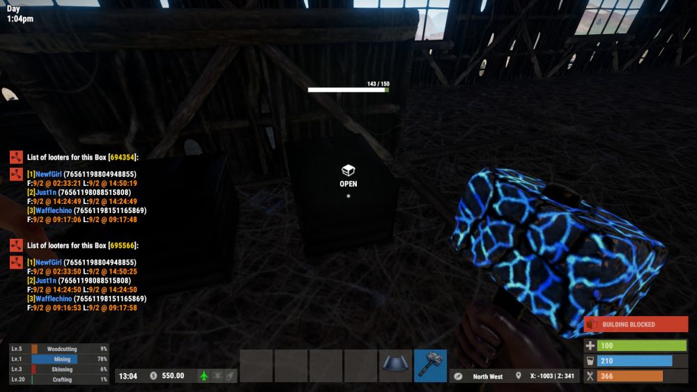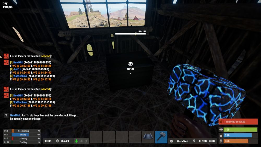 Time: 3:30pm CST Length of Ban: Permanemt Reason: Raiding/Looting/Greifing Server: Survival PvE More Info: I was asked by NewfGirl to check a few boxes of hers cause she claimed that someone had looted them. Upon inspection it showed that they had been looted by the accused (as shown in pictures). I asked why Jord1n was on the box and she said that he had come to help and gave some things after the incident.