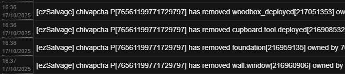 Offender: chivapcha P Steam Battlemetrics Server: EU Scourge Time: 17/10/25 21:23 BST Length: Perm Reason: Raiding More Info (Optional): While investigating an unrelated complaint I noticed that chivapcha had a lot of salvage logs for a player they were not connected to, looking into it revealed he had destroyed another players base and had done so previously too. Chivapcha has multiple other warnings on record that were picked up within days of joining the server and clearly can not follow the servers rules.