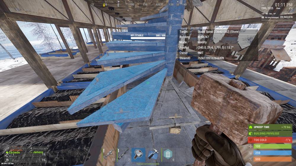 A player on EU Scourge BM is adamant that they had enough upkeep to last until wipe, claiming that they checked the upkeep in the tool cupboard just last night but upon logging in today the base was completely gone. No evidence of foul play in BM logs and nothing remains in game to give evidence of what happened. U18 near bandit camp. > printpos (696.4, 49.4, -554.0) > console.copy