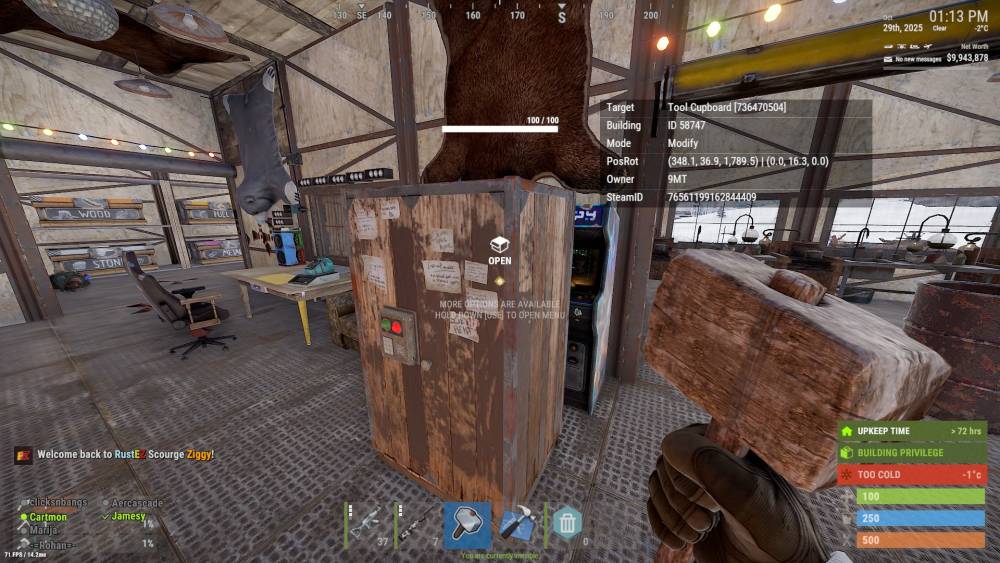 Offender: 9MT BM Steam Server: EU Scourge Time: 02:55 BST Length: Perm Reason: Raiding More Info (Optional): Player has 2 previous warnings for raiding decaying bases from previous wipes, details noted on BM. I noticed a player report filed against 9MT saying it appeared that they were raiding a decaying base. Upon reviewing their salvage logs, it was clear that was exactly what was taking place. I logged into the server and witnessed them at the base, and their raid base built just outside the base which they had taken over with their own doors, locks and TC. 9MT was the sole looters on nearly all the boxes inside the base, and the large furnaces outside the base as the original base owned was a solo player. Given that 9MT has 2 previous warnings for the same actions, I decided to implement a ban at this stage to prevent further damage.